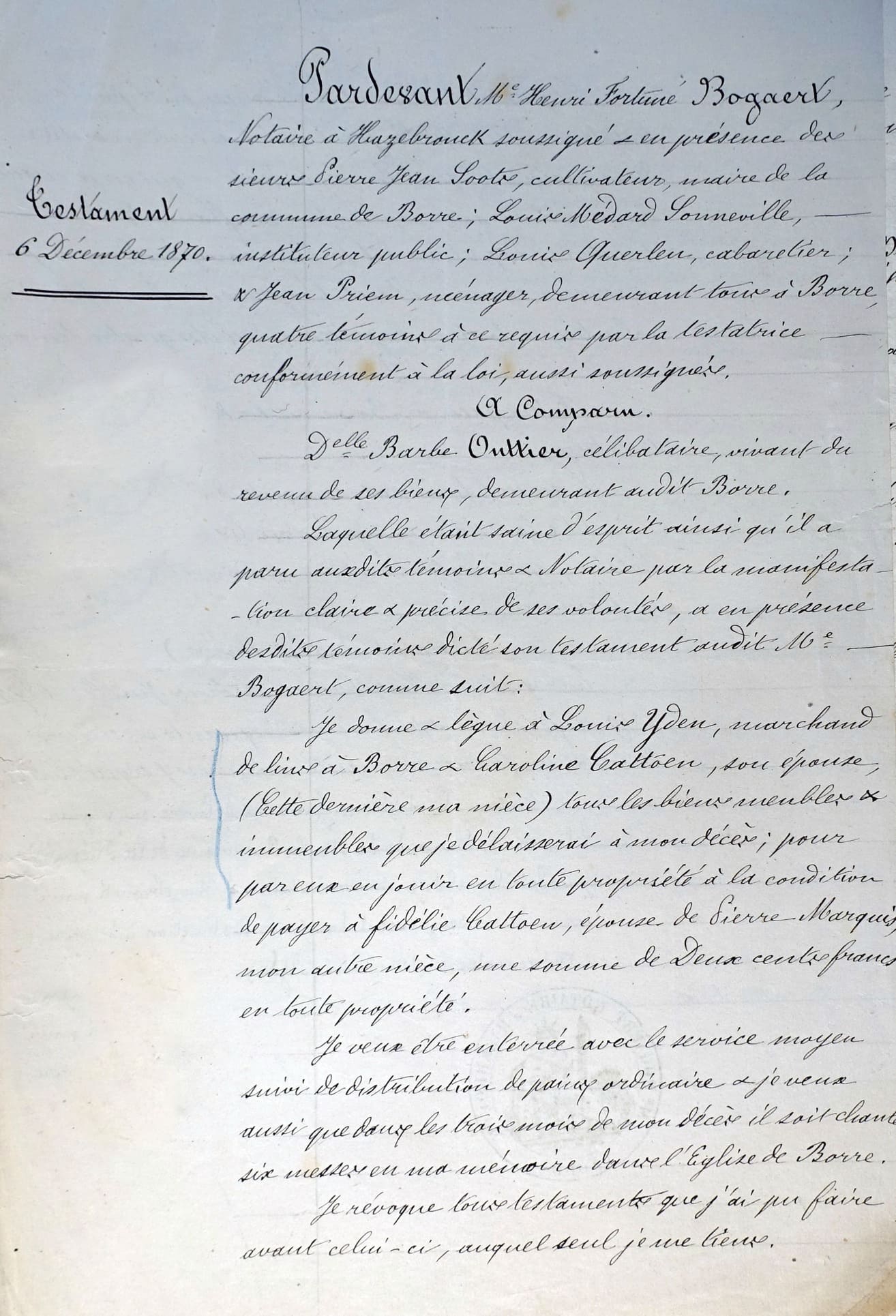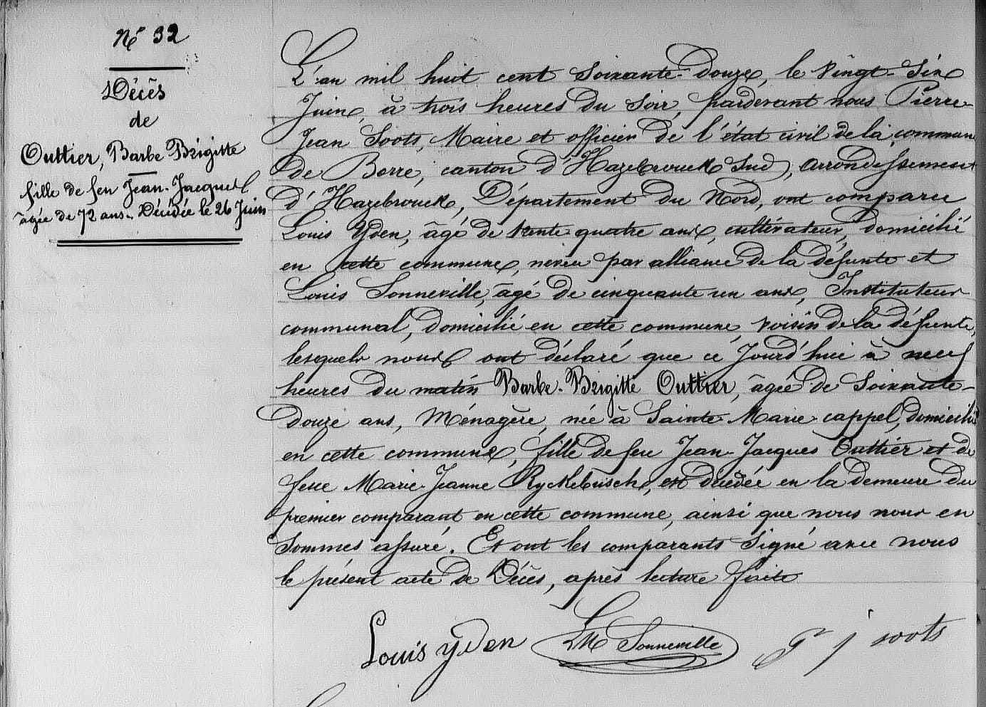* Barbe Brigitte Outtier était la tante maternelle de Caroline Catoen, l’épouse de Louis Yden. Elle était née en 1800 et ne s’était jamais mariée. Elle mourut le mercredi 26 juin 1872 chez Louis Yden qui déclara son décès en mairie (voir son acte de décès). Deux ans plus tôt, elle avait fait un testament chez Maître Bogaert, notaire à Hazebrouck.