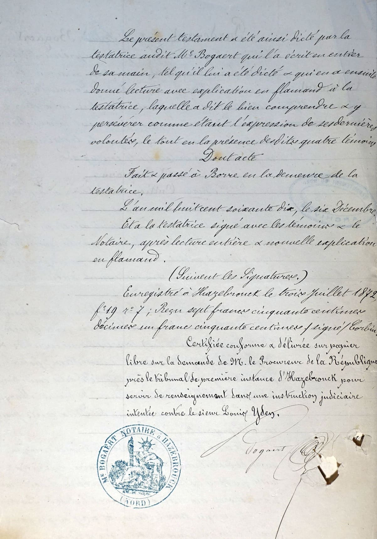 Le mardi 8 août le juge prit connaissance des copies d’actes notariés que Me Bogaert, notaire à Hazebrouck, lui avait fait parvenir. Un nouvel interrogatoire de Louis Yden fut planifié dès le lendemain.