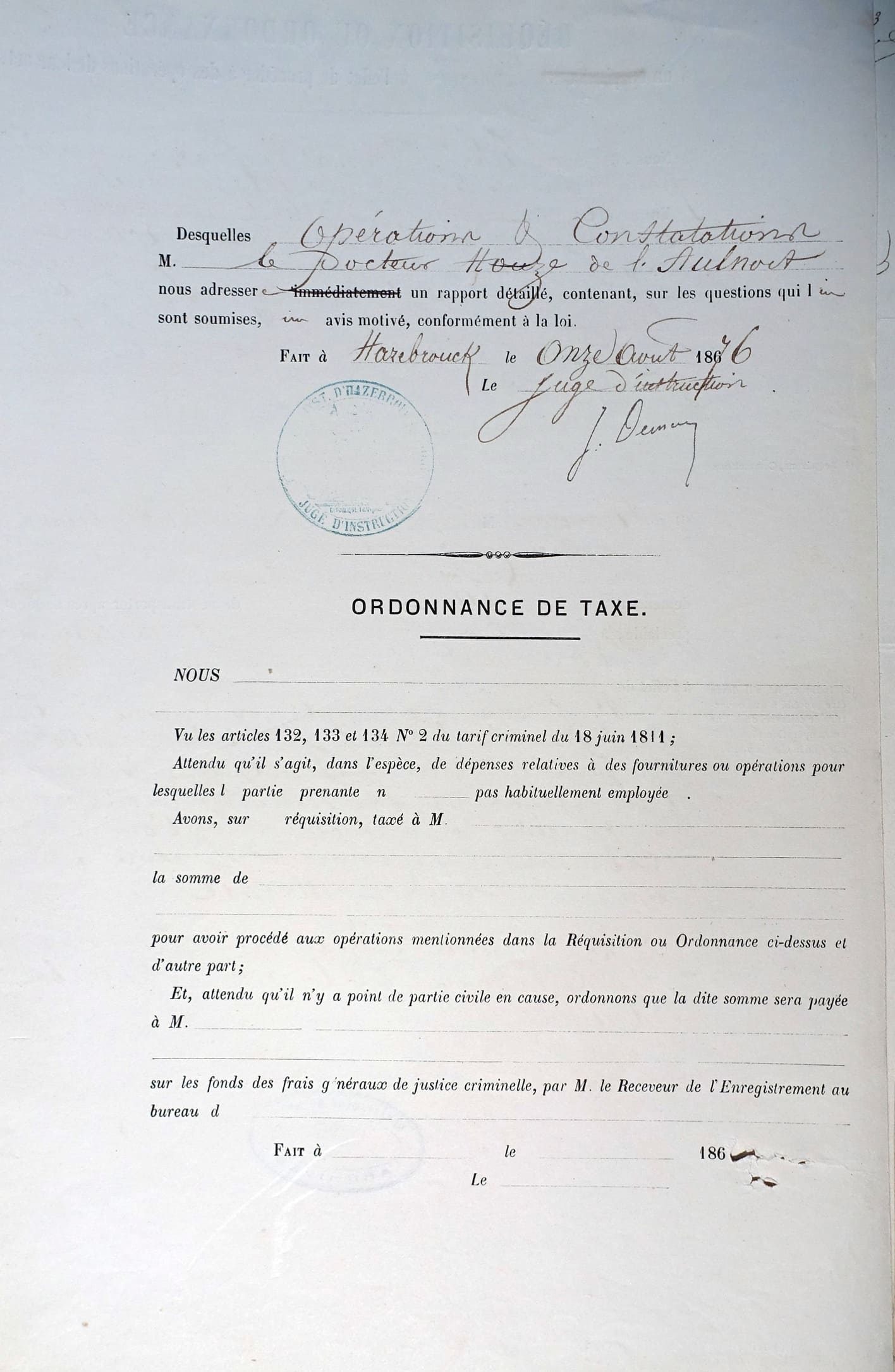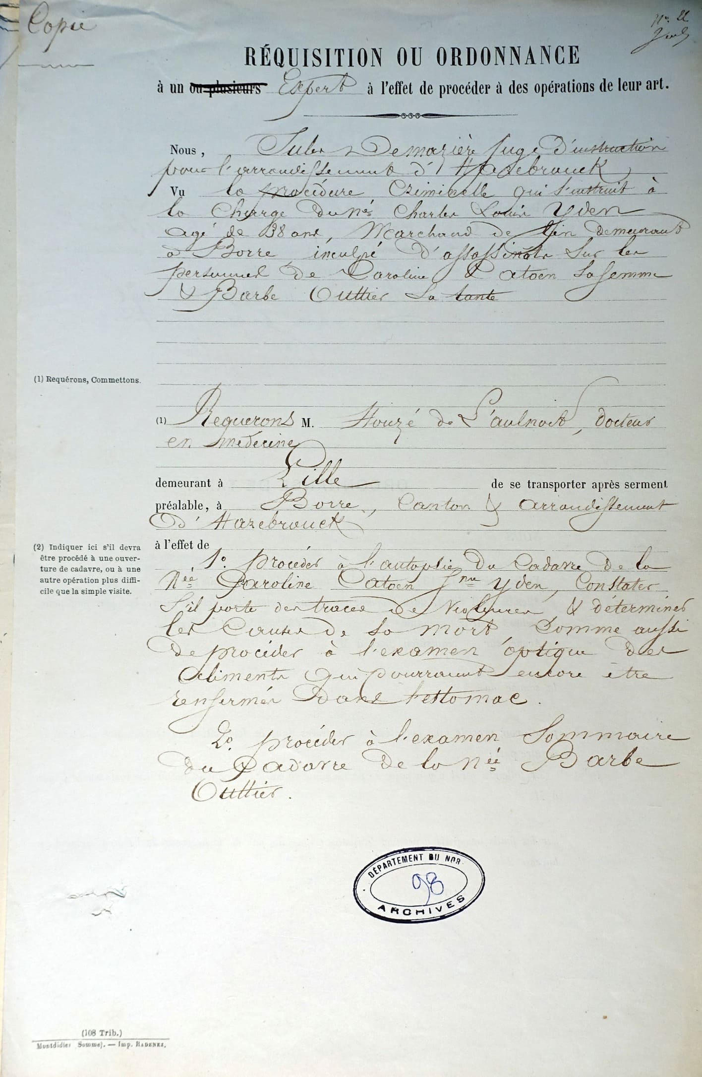 Le lendemain, vendredi 11 août 1876, le juge ordonna que soient pratiquées les autopsies des corps de Caroline Catoen et de Barbe Outier.