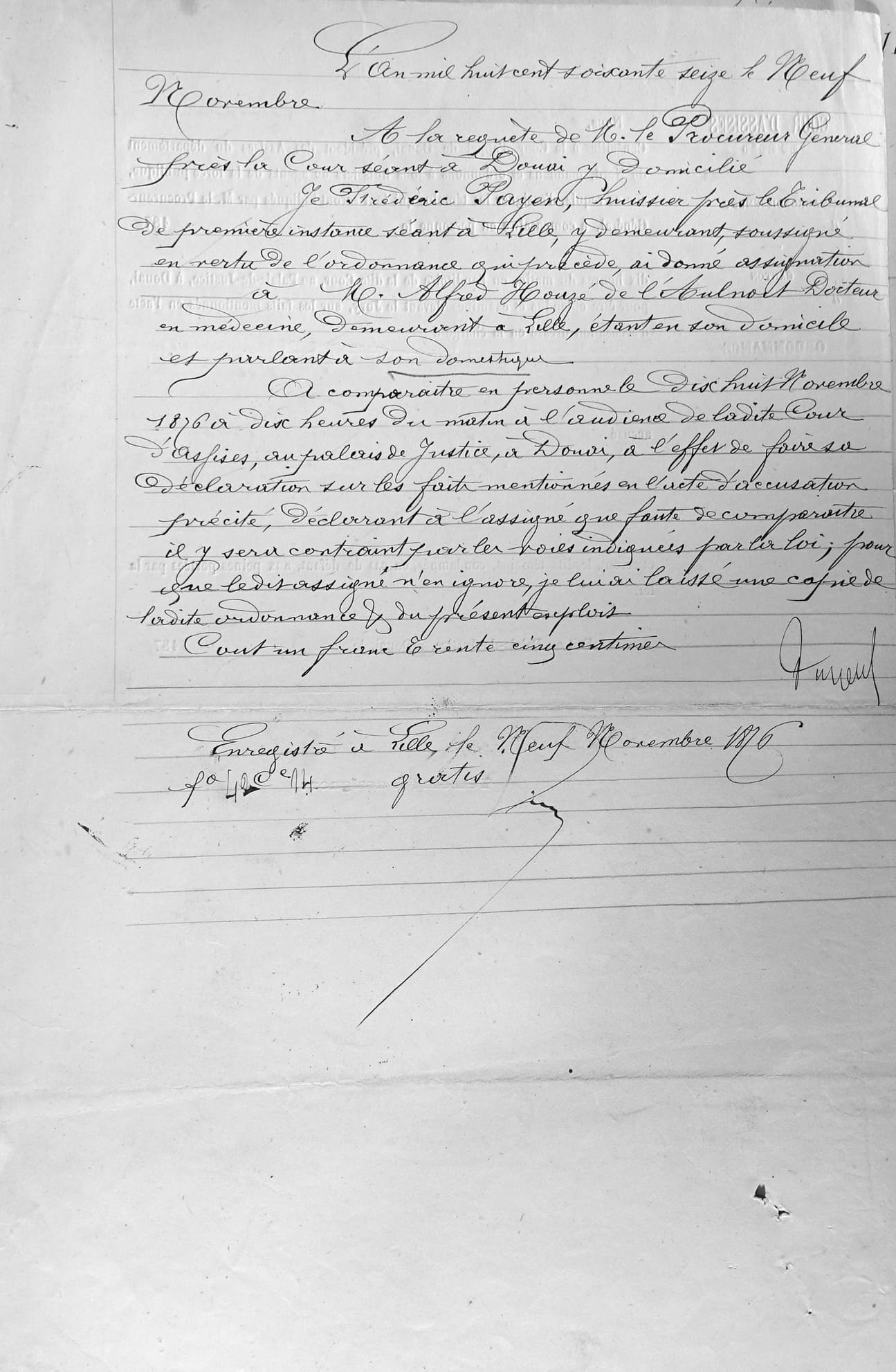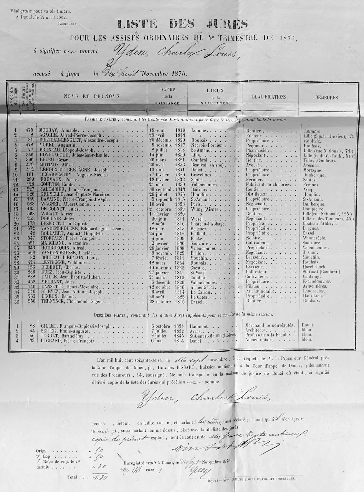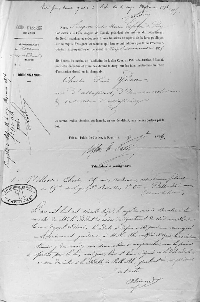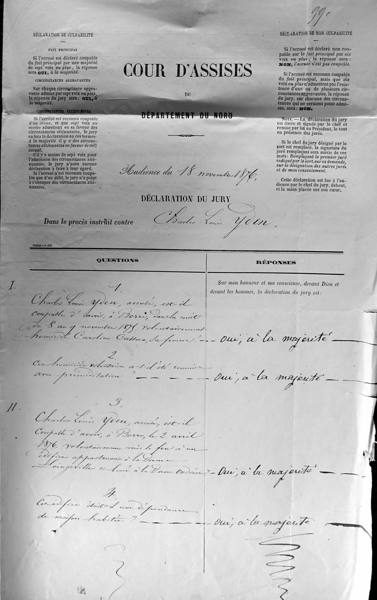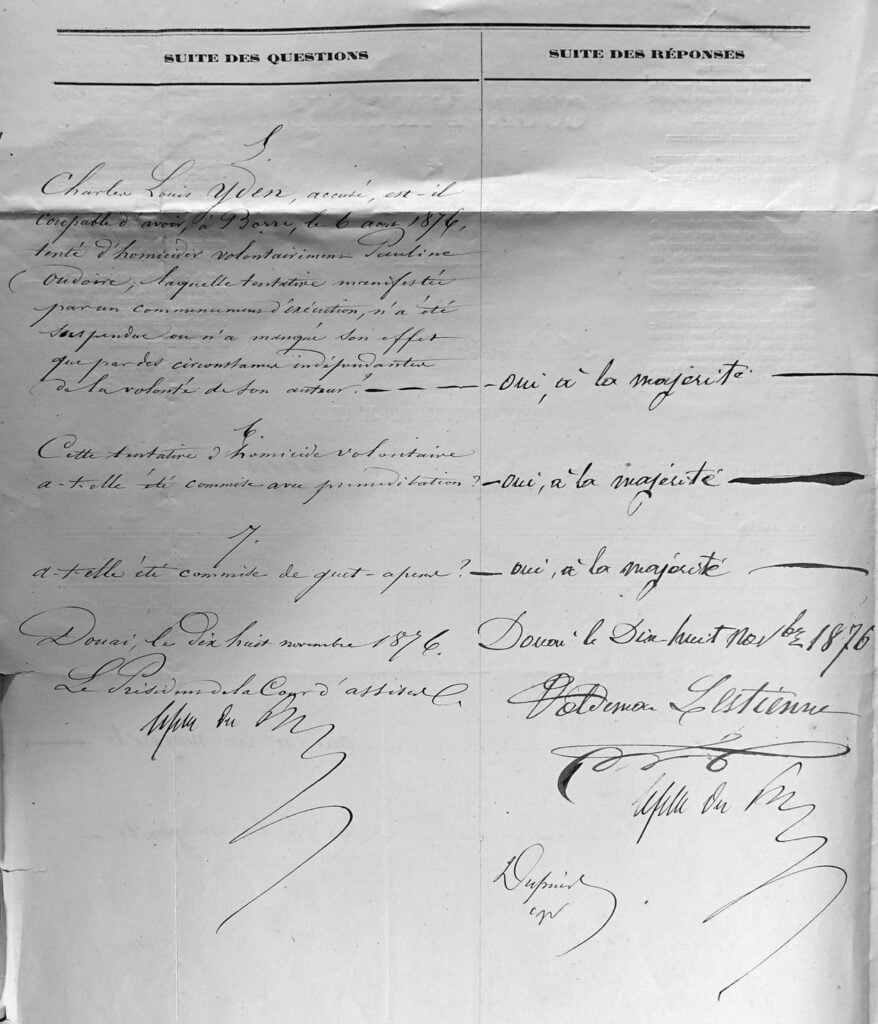 Nous, Auguste Victor Marie Lefebvre du Prey1, Président de la Cour d’Assises du Département du Nord, en présence de M. Jorant2, Procureur Général, tenant la plume M. Dupuis3 Commis Greffier assermenté, avons fait introduire dans une des salles du Palais de Justice, les jurés de la présente session et le nommé Charles Louis Yden, accusé d’assassinat, d’Incendie et de tentative d’assassinat.