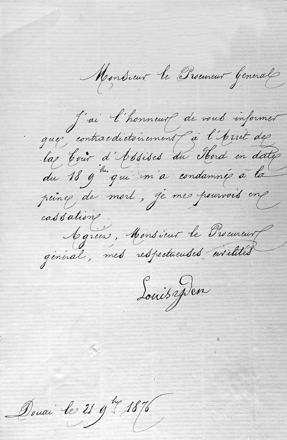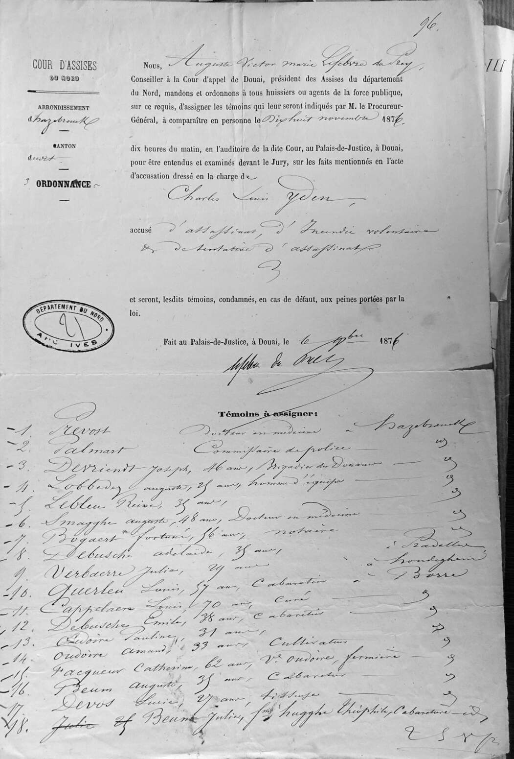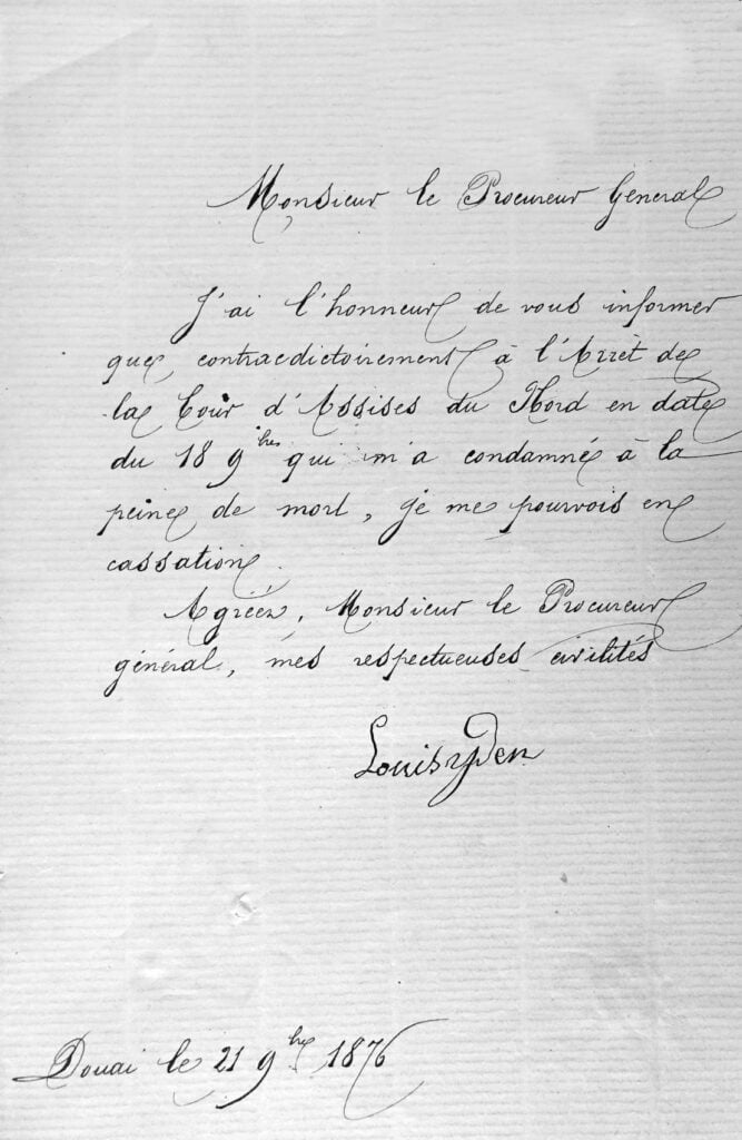 Le mardi 29 août, le juge avait rédigé son ordonnance de fin d’instruction. Le 8 septembre, le Procureur Général près la cour d’appel de Douai renvoyait Louis Yden devant la cour d’assises. Le 16, il rédigeait l’acte d’accusation. Le 14 octobre, Louis Yden en était informé ainsi que de l’arrêt de la cour d’appel le renvoyant devant la cour d’assises. Le 15, il était transféré de la prison d’Hazebrouck à celle de Douai dans l’attente de son procès. Me d’Hooghe, avocat à Douai était nommé d’office pour le défendre. Le procès en cour d’assises était fixé au samedi 18 novembre 1876 à 10 heures.