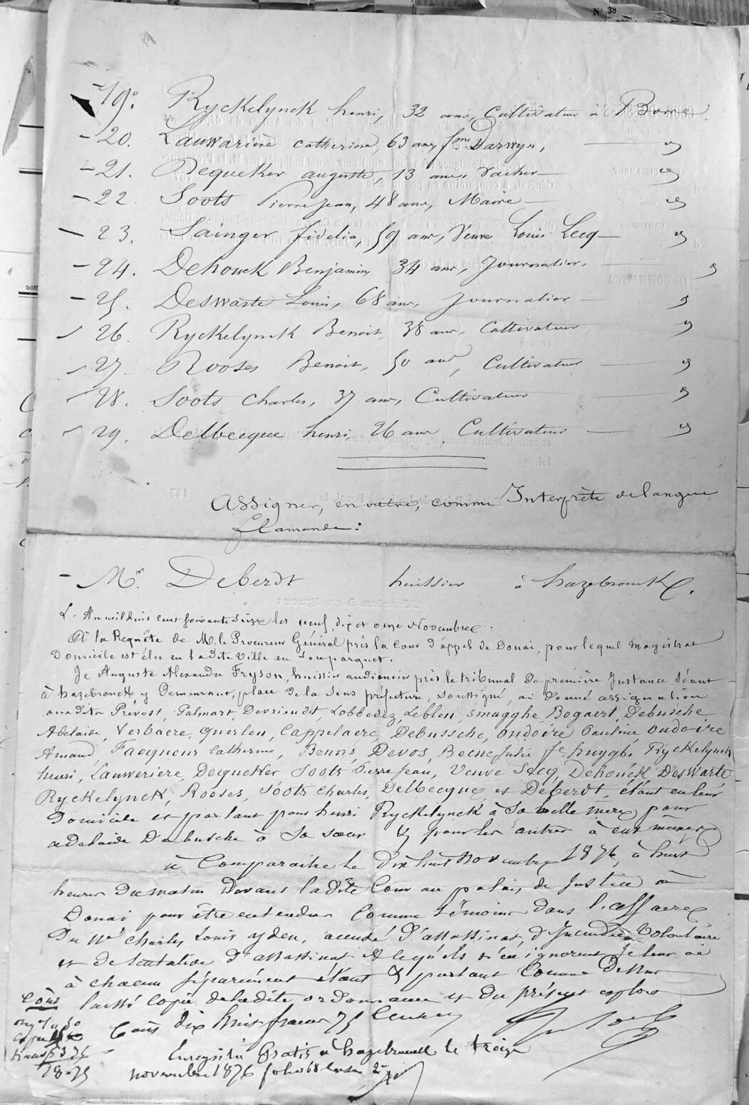 L’accusé ne parlant pas la langue française, nous avons nommé d’office pour lui servir d’interprète le Sr Deberdt Fidèle Amand4, âgé de 65 ans, huissier demeurant à Hazebrouck, interprète de langue flamande, lequel étant présent et n’ayant été récusé ni par l’accusé ni par le Ministère public, a prêté en nos mains le serment prescrit par l’article 332 du code d’instruction criminelle.