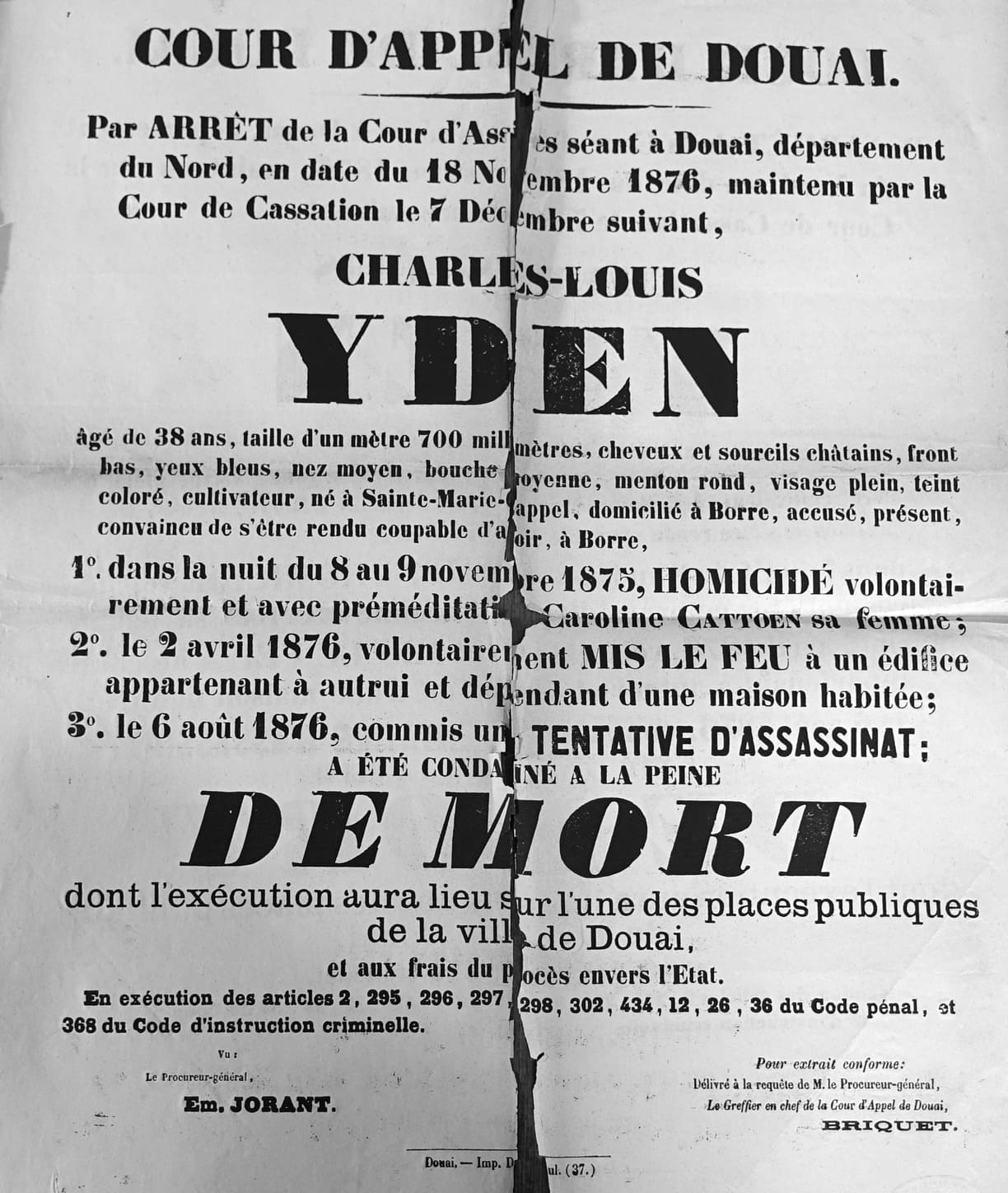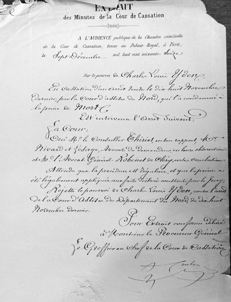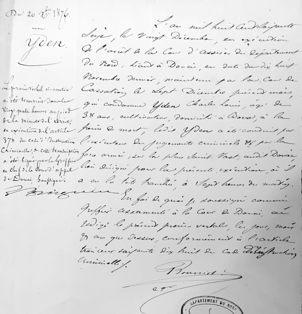 Le Président a lu le texte de la loi et prononcé l’arrêt qui condamne Charles Louis Yden à la peine de mort et aux frais du procès envers l’Etat ; ordonne que l’exécution aura lieu sur l’une des places publiques de la ville de Douai.