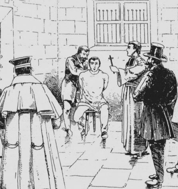 M. le directeur des prisons du Nord entre à 4 heures 1/4 du matin dans la prison d’Yden ; il est suivi du Révérend Père jésuite Houvenaïghel qui, connait la langue flamande, dans laquelle, seule, s’exprime le condamné. M. le gardien chef, M. le greffier de la prison, M. le commissaire central Lafont, sont du funèbre cortège.