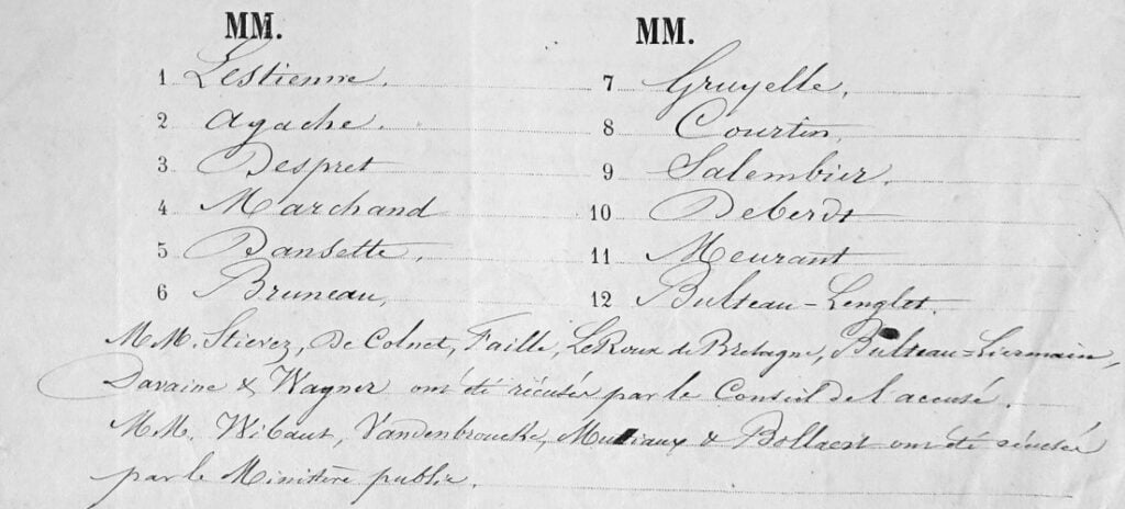 Avons également fait introduire le Conseil du dit accusé et en leur présence, nous avons fait faire par le Greffier l’appel nominal desdits jurés non excusés ni dispensés, compris dans la liste des trente-six*.