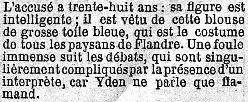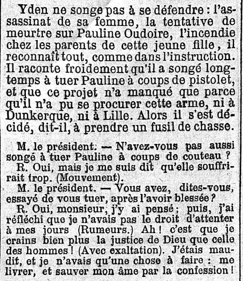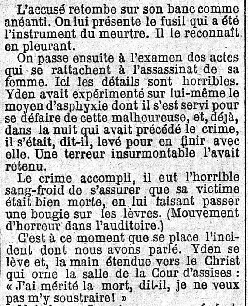Yden a souvent entendu le mot mourir résonner à ses oreilles, il en connait la valeur, aussi s’écrie-t-il en flamand : « Tod, Tod (la mort), Ya, Ya (oui, oui) ». Et tombant alors à genoux, les bras emprisonnés dans les manches de la camisole de force, il demande pardon à Dieu et aux hommes du crime qu’il a commis. Il remet ces quelques lignes écrites de sa main :