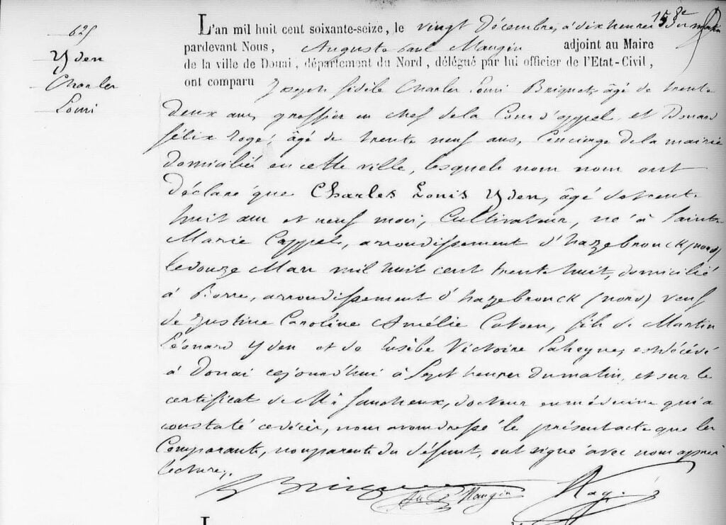 Sur les interpellations de M. le Président l’accusé a répondu se nommer : Yden Charles Louis, âgé de 38 ans, cultivateur, né à Sainte-Marie-Cappel, demeurant à Borre.