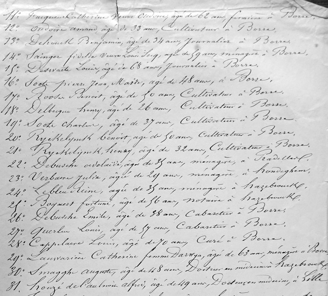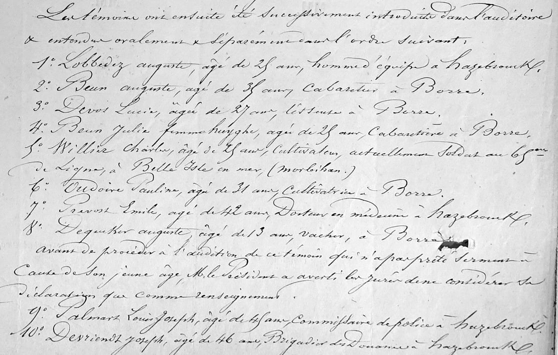A ces 29 assignations s’ajoutent celle du Docteur Houzé de l’Aulnoit (demeurant à Lille) et celle de Charles Willier (il accompagnait Pauline au retour de la messe lors de la tentative d’assassinat) qui était alors soldat au 65e de ligne à Belle-Île-en-Mer (Morbihan).