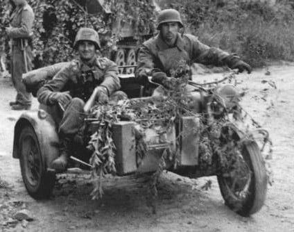 C’est dans cette position qu’un après-midi, nous avons vu arriver du Mont-de-terre une moto avec un side-car. Sur la moto, un soldat allemand et un autre dans le side-car armé d’une mitrailleuse.