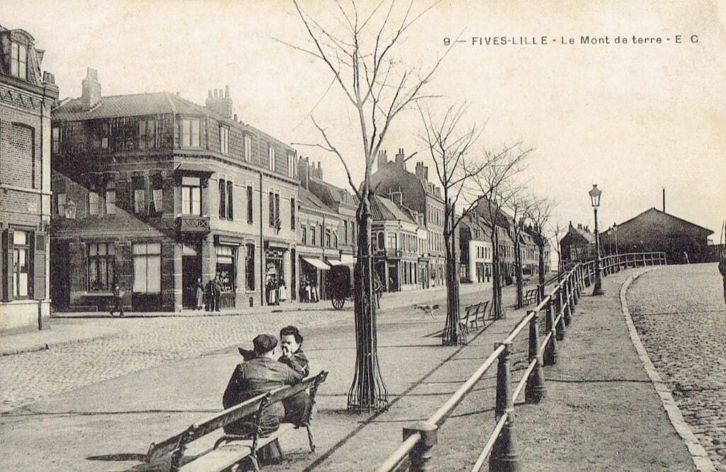 Nous avons peu de bagage, le strict nécessaire est chargé dans la voiture de ma petite sœur. Nous sommes sept : ma grand-mère, ma mère, madame Normand, mon copain André, sa sœur Jeanine, ma petite sœur et moi. André et moi marchons devant. Toute cette petite troupe prend le chemin du Mont-de-terre, puis le pont du chemin de fer, la rue de Bavay, la porte de Valenciennes, la rue de Valenciennes. Mais André et moi sommes déjà fatigués. On s’assied sur toutes les pierres bleues des maisons.