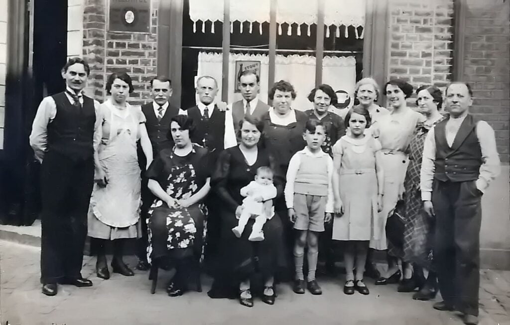De gauche à droite : Emile et sa femme Stella. – Adolphe : frère d’Emile – Célinie ma maman assise – Victor le papa de Stella ci-dessus – Alfred le fils de Victor et frère de Stella – Marie son épouse – Leur bébé Stella – Louise la femme de Victor et la sœur de ma grand-mère – Moi – Jeanne ma « grand-mère à tartes » – Christiane la fille d’Alfred et Marie – Jeanne la femme d’Adolphe ci-dessus – Andrée la fille de Raymonde ci-après – Raymonde la fille de Victor et Louise – et enfin mon papa Gustave.