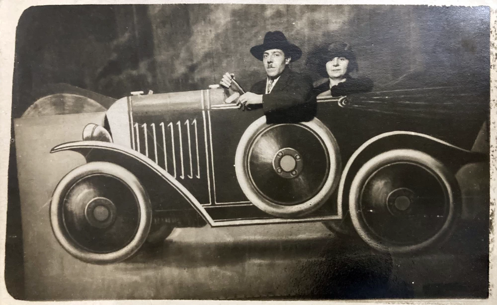 Elise et Henri posent derrière un décor de voiture des années 1920 de type Citroën .