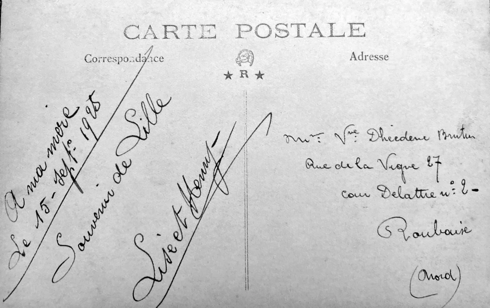 La carte est adressée à Madame veuve Dheedene Brutin, 27 rue de la vigne, cour Delattre N°2, à Roubaix. Il s’agit de la maman d’Henri, autrement dit mon arrière-grand-mère : Virginie Brutin, alors âgée de cinquante-sept ans.