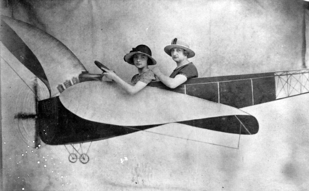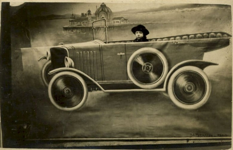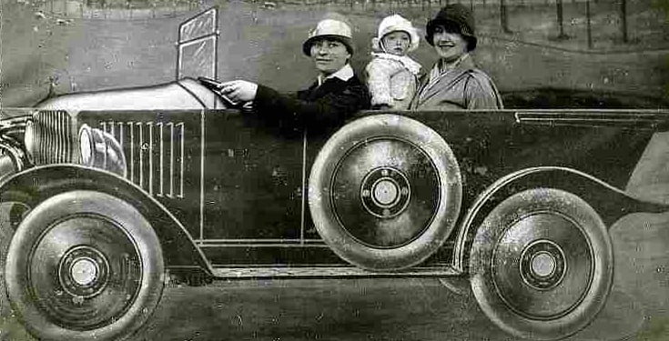 Après quelques recherches, il est possible d’affirmer que cette photographie a été prise dans une fête foraine. On y trouvait ce genre de stand où l’on posait derrière un décor « trompe-l’œil » représentant une voiture ou un avion par exemple.