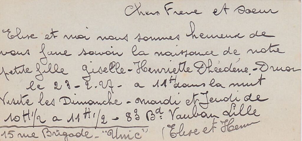 Quelle émotion de découvrir cette carte postale ! Je ne savais pas que Lise était le « petit nom » de ma grand-mère ni pourquoi mon grand-père a signé ici « Henry », ancienne orthographe de ce prénom.