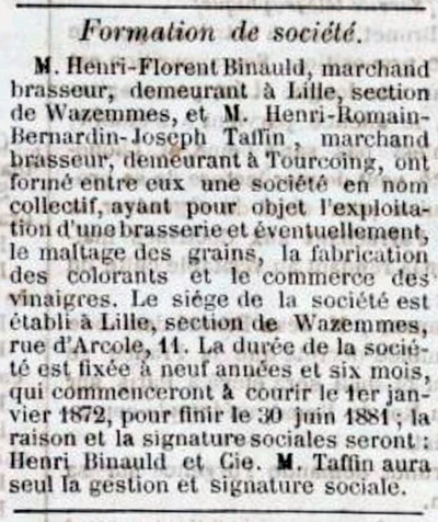 Henri Romain Bernardin Joseph Taffin a cinquante-huit ans. Il est marchand brasseur. En 1872, avec son beau-frère Henri Florent Binauld, il crée la société Henri Binauld et Cie, ayant pour objet l’exploitation d’une brasserie. Henri Taffin est marié depuis le 10 octobre 1860 avec Marie Noël Binauld3, la sœur de son futur associé.