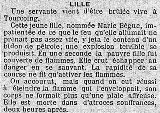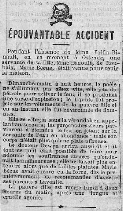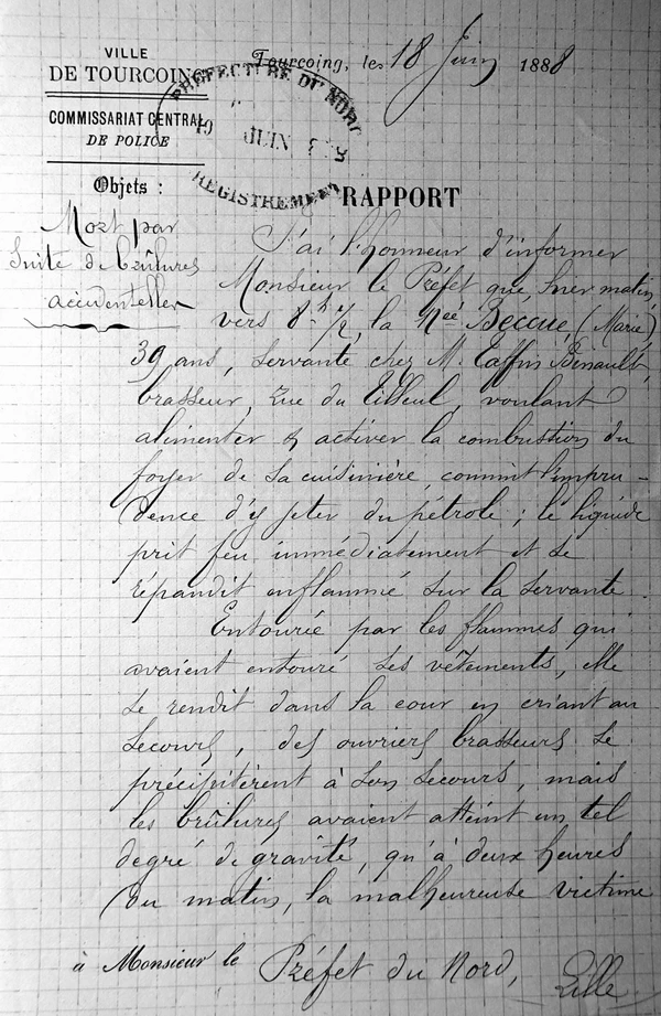 J’ai l’honneur d’informer Monsieur le Préfet que, hier matin, vers 8h1/2, la Née Béccue (Marie), 39 ans, servante chez M. Taffin Binauld, brasseur, rue du tilleul, voulant alimenter et activer la combustion du foyer de sa cuisinière, commit l’imprudence d’y jeter du pétrole ; le liquide prit feu immédiatement, et se répandit enflammé sur la servante.