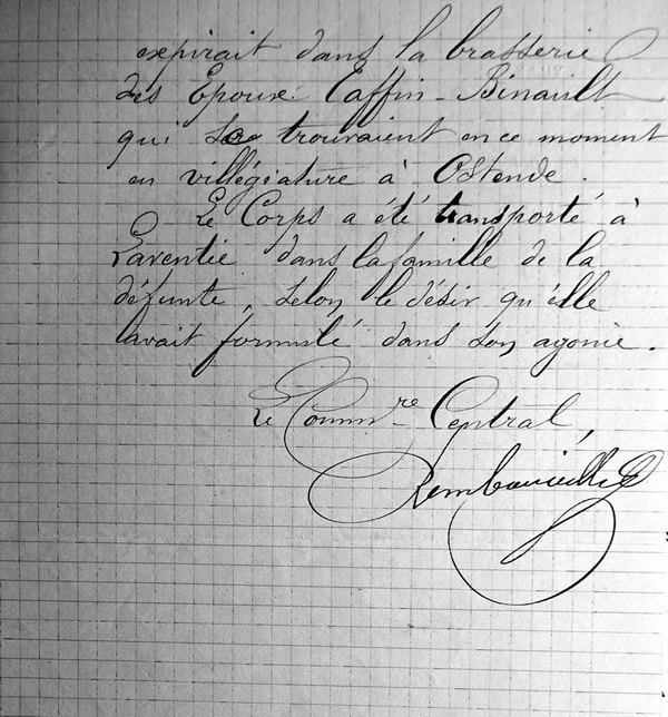 Entouré par les flammes qui avaient entouré ses vêtements, elle se rendit dans la cour en criant au secours, des ouvriers brasseurs se précipitèrent à son secours, mais les brûlures avaient atteint un tel degré de gravité, qu’à deux heures du matin, la malheureuse victime expirait dans la brasserie des époux Taffin-Binauld qui se trouvaient en ce moment en villégiature à Ostende.