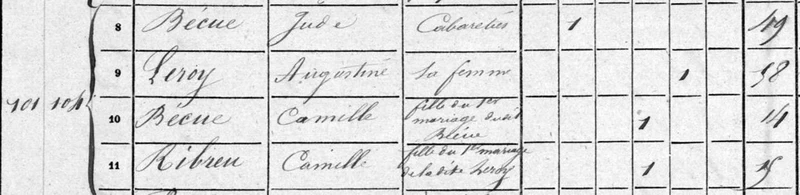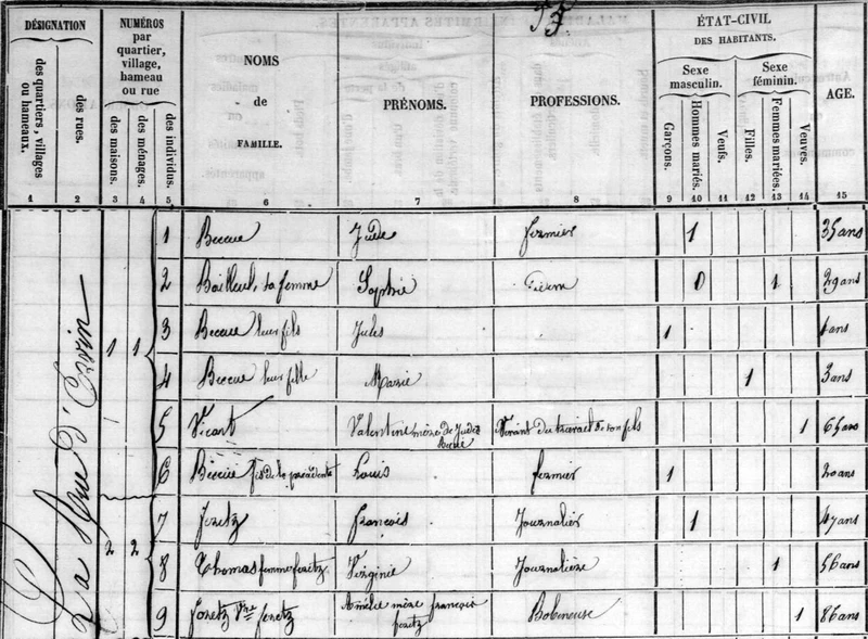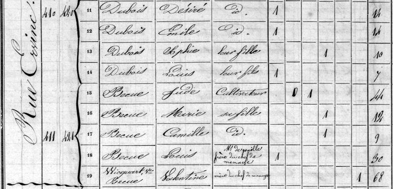 En mai 1856 au recensement, le père Jude, désormais marchand de paille, est présent avec ses trois enfants. Vivent toujours avec eux la grand-mère Valentine et également l’oncle Louis.