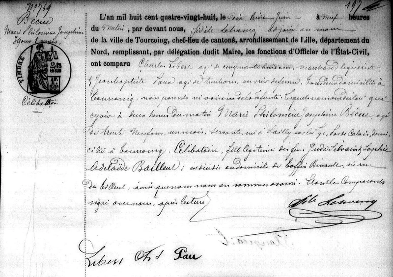 L’an mil huit cent quatre-vingt-huit, le dix-huit juin à neuf heures du matin, par devant nous, fidèle lehoucq adjoint au maire de la ville de Tourcoing, chef lieu de canton, arrondissement de Lille, département du Nord, remplissant par délégation dudit Maire les fonctions d’officier de l’Etat Civil, ont comparu Charles Libert âgé de cinquante-huit ans, marchand liquoriste et Jean Baptiste Pau âgé de trente ans ouvrier de ferme, tous deux domiciliés à Tourcoing non parents ni voisins de la défunte. Lesquels nous ont déclaré que ce jour à deux heures du matin Marie Philomène Joséphine Bécue, âgée de trente-neuf ans un mois, servant, née à Sailly-sur-la-Lys, Pas-de-Calais domiciliée à Tourcoing, célibataire, fille légitime des feus Jude Silvain et Sophie Adelaïde Bailleul, est décédée au domicile de Taffin-Binauld sis rue du tilleul ainsi que nous nous en sommes assuré. Et ont les comparants signé avec nous après lecture ./.