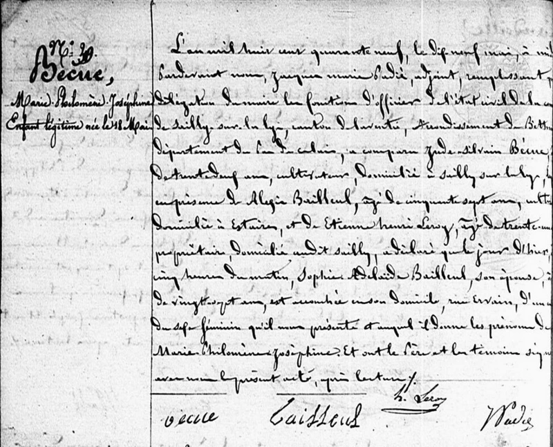 L’an mil huit cent quarante neuf, le dix neuf mai, à midi, par devant nous Jacques Marie Padie, adjoint, remplissant par délégation du maire les fonctions d’officier de l’état civil de la commune de Sailly-sur-la-Lys, canton de Laventie, arrondissement de Béthune, département du Pas-de-Calais, a comparu Jude Silvain Bécue âgé de trente-deux ans, cultivateur, domicilié à Sailly-sur-la-Lys, lequel en présence de Alexis Bailleul, âge de cinquante-sept ans, cultivateur domicilié à Estaires, et de Etienne Henri Leroy, âgé de trente-et-un ans, propriétaire domicilié audit Sailly, a déclaré que le jour d’hier, à cinq heures du matin, Sophie Adelaïde Bailleul, son épouse, âgée de vingt-sept ans, est accouchée en son domicile, rue Ervain, d’une enfant du sexe féminin qu’il nous a présenté et auquel il donne les prénoms de Marie Philomène Joséphine. Et ont le père et les témoins signé avec nous le présent acte, après lecture ./.