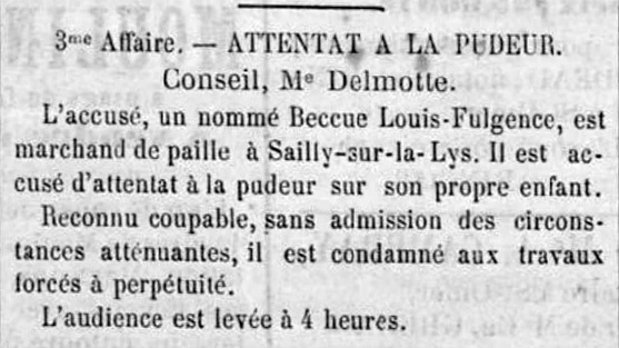 Le 11 juin 1872, l’oncle Louis, est condamné par les assises de Saint-Omer aux travaux forcés à perpétuité pour « attentat à la pudeur sur son propre enfant ».