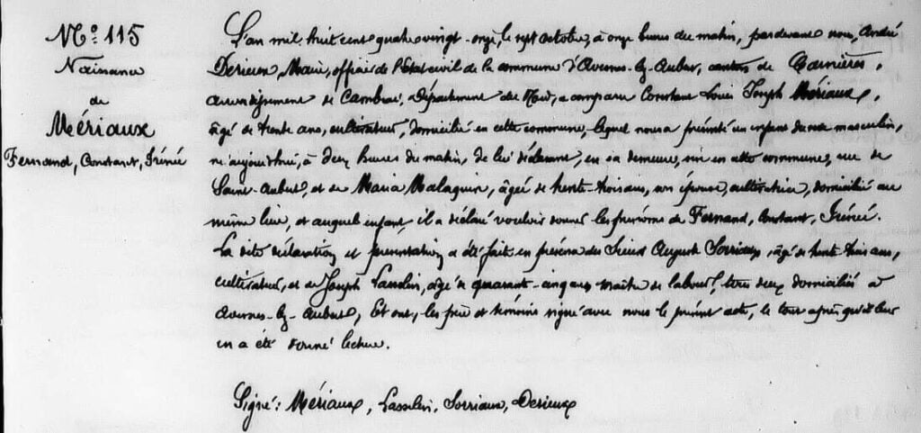 L’an mil huit cent quatre-vingt-onze, le sept octobre à onze heures du matin, par devant nous André Derieux, Maire, officier de l’état civil de la commune d’Avesnes-lez-Aubert, canton de Carnières, arrondissement de Cambrai, département du Nord, a comparu Constant Louis Joseph Mériaux, âgé de trente ans, cultivateur, domicilié en cette commune, lequel nous a présenté un enfant du sexe masculin, né aujourd’hui, à deux heures du matin, de lui déclarant, en sa demeure sise en cette commune rue de Saint Aubert, et de Maria Malaquin, âgée de trente-trois ans, son épouse, cultivatrice, domiciliée au même lieu, et auquel enfant il a déclaré vouloir donner les prénoms de Fernand, Constant, Irénée. La dite déclaration et présentation a été faite en présence des sieurs Auguste Sorriaux, âgé de trente-trois ans, cultivateur, et de Joseph Lamelin, âgé de quarante-cinq ans, maître de labour, tous deux domiciliés à Avesnes-lez-Aubert. Et ont, les père et témoins, signé avec nous le présent acte, le tout après qu’il leur en a été fait lecture ./.