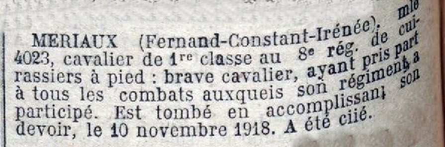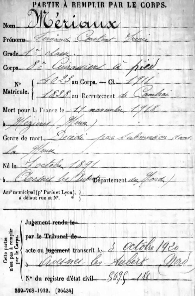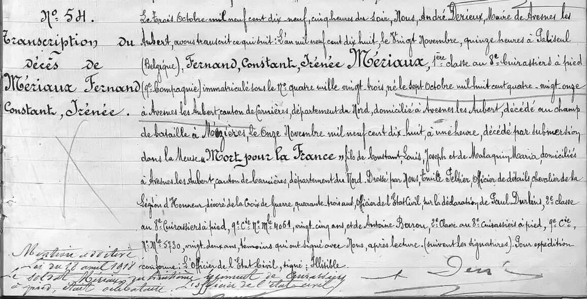 Le trois octobre mil neuf cent dix-neuf, cinq heures du soir, nous, André Derieux*, maire de Avesnes les Aubert, avons transcrit ce qui suit : l’an mil neuf cent dix huit le vingt novembre, quinze heures à Paliseul (Belgique), Fernand, Constant, Irénée Mériaux, 1ère classe au 8e Cuirassiers à pied (9e Compagnie) immatriculé sous le N° quatre mille vingt-trois, né le sept octobre mil huit cent quatre-vingt-onze à Avesnes les Aubert, canton de Carnières, département du Nord, domicilié à Avesnes les Aubert, décédé au champ de bataille à Mézières le onze novembre mil neuf cent dix-huit, à une heure, décédé par submersion dans la Meuse « Mort pour la France », fils de Constant Louis Joseph et de Malaquin Maria, domiciliés à Avesnes les Aubert, canton de Carnières, département du Nord. Dressé par nous, Emile Peltier, officier de détails chevalier de la Légion d’Honneur, décoré de la Croix de Guerre, quarante-trois ans, officier de l’Etat Civil, sur la déclaration de Paul Durlin, 2e classe au 8e Cuirassiers à pied, 9e Cie N° Mle 4061, vingt-cinq ans, et de Antoine Baron, 2e classe au 8e Cuirassiers à pied, 9e Cie, N° Mle 5730, vingt-deux ans, témoins qui ont signé avec nous, après lecture, (suivent les signatures)