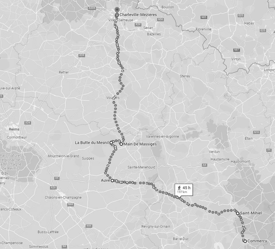Fernand et son Régiment embarquent en automobiles, à destination du camp d’Auve. Ils sont finalement mis à la disposition de la IVème Armée, qui poursuit l’ennemi dans la direction de Mézières.
