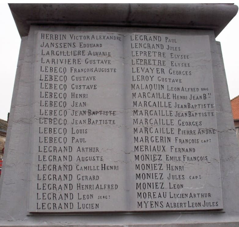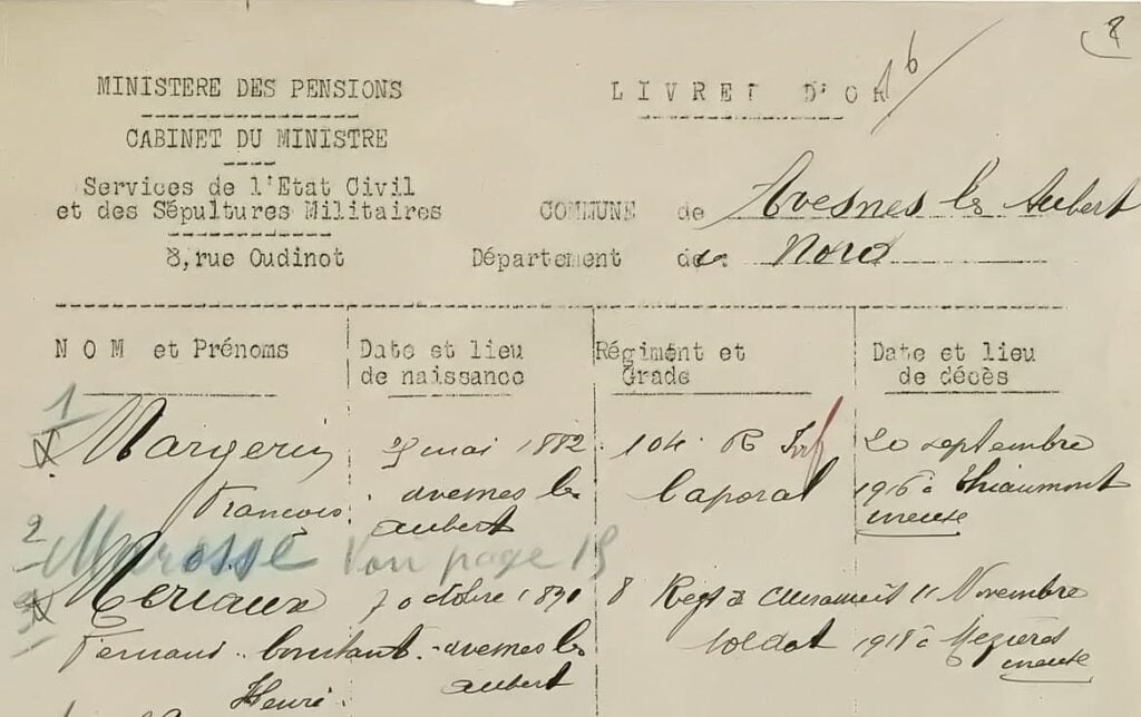 Fernand Mériaux figure sur le monument aux morts de Avesnes-les-Aubert, ainsi que sur le Livre d’Or.