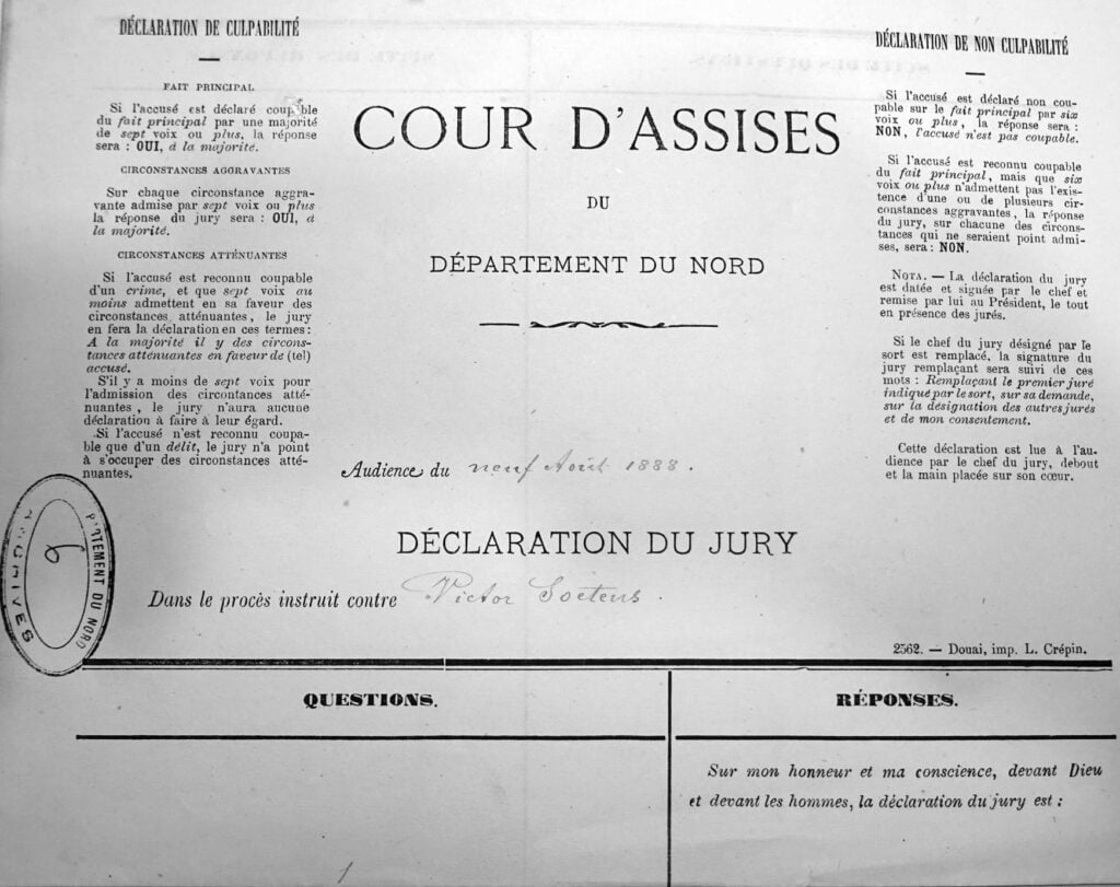 Huit jours plus tard, le mercredi 18 juillet, la Chambre des mises en accusation de la Cour d’appel de Douai, envoyait Victor Soetens devant la Cour d’assises pour y être jugé.
