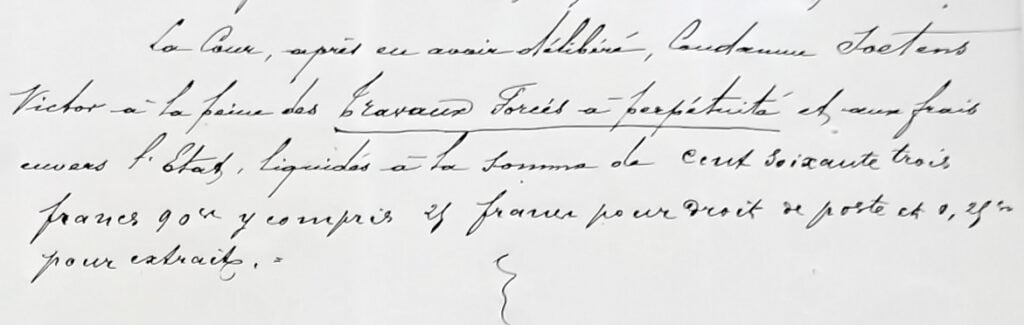 M. le Président a lu le texte de la loi et prononce l’arrêt qui condamne Victor Soetens à la peine des travaux forcés à perpétuité et au frais du procès envers l’Etat.