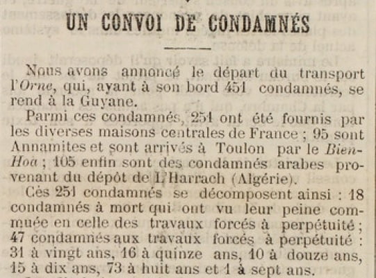 Six mois plus tard, le 20 janvier 1889, le condamné embarquait à Toulon sur « L’Orne » à destination de la Guyanne.