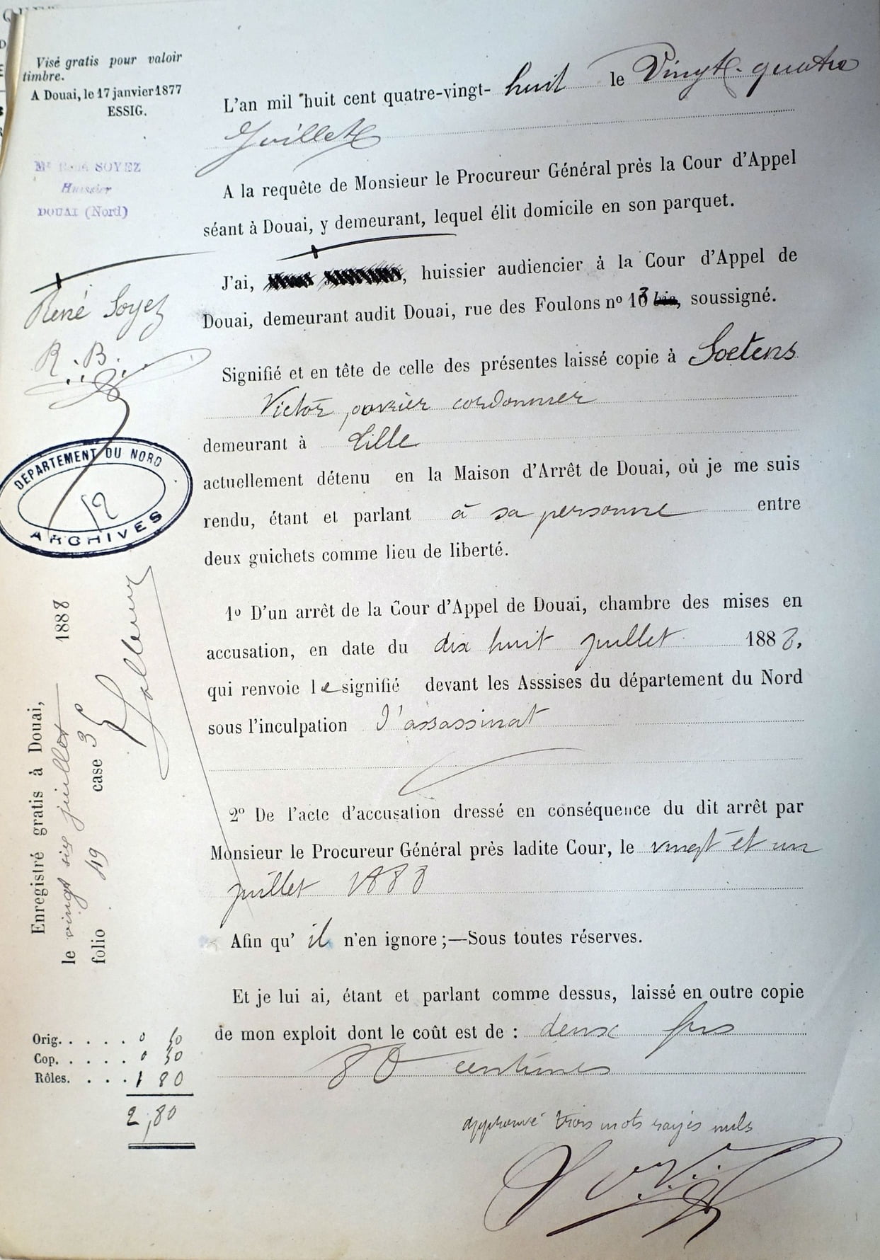 Trois jours plus tard, le mardi 24 juillet, un huissier remettait à Victor Soetens une copie de l’arrêt de la chambre des mises en accusation ainsi que l’acte d’accusation du Procureur Général.