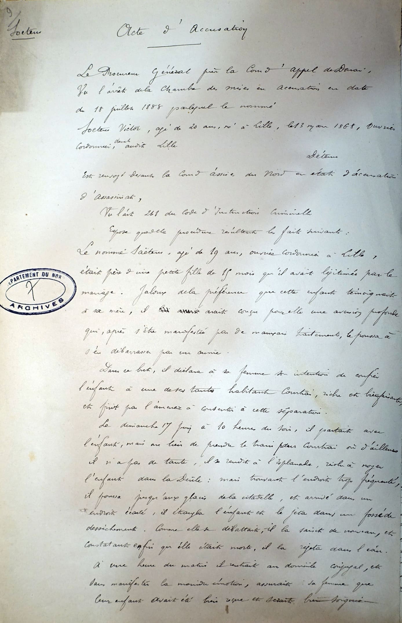 « D’avoir, à Lille, le 17 juillet 1888, volontairement donné la mort à sa fille Madeleine Augustine, née le 6 mars 1887. »