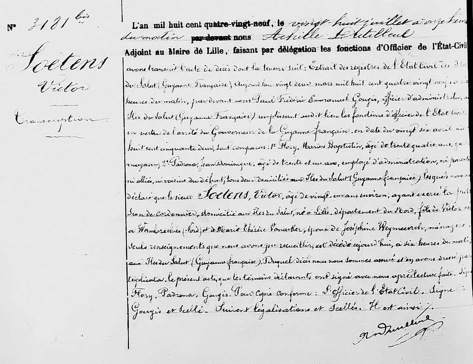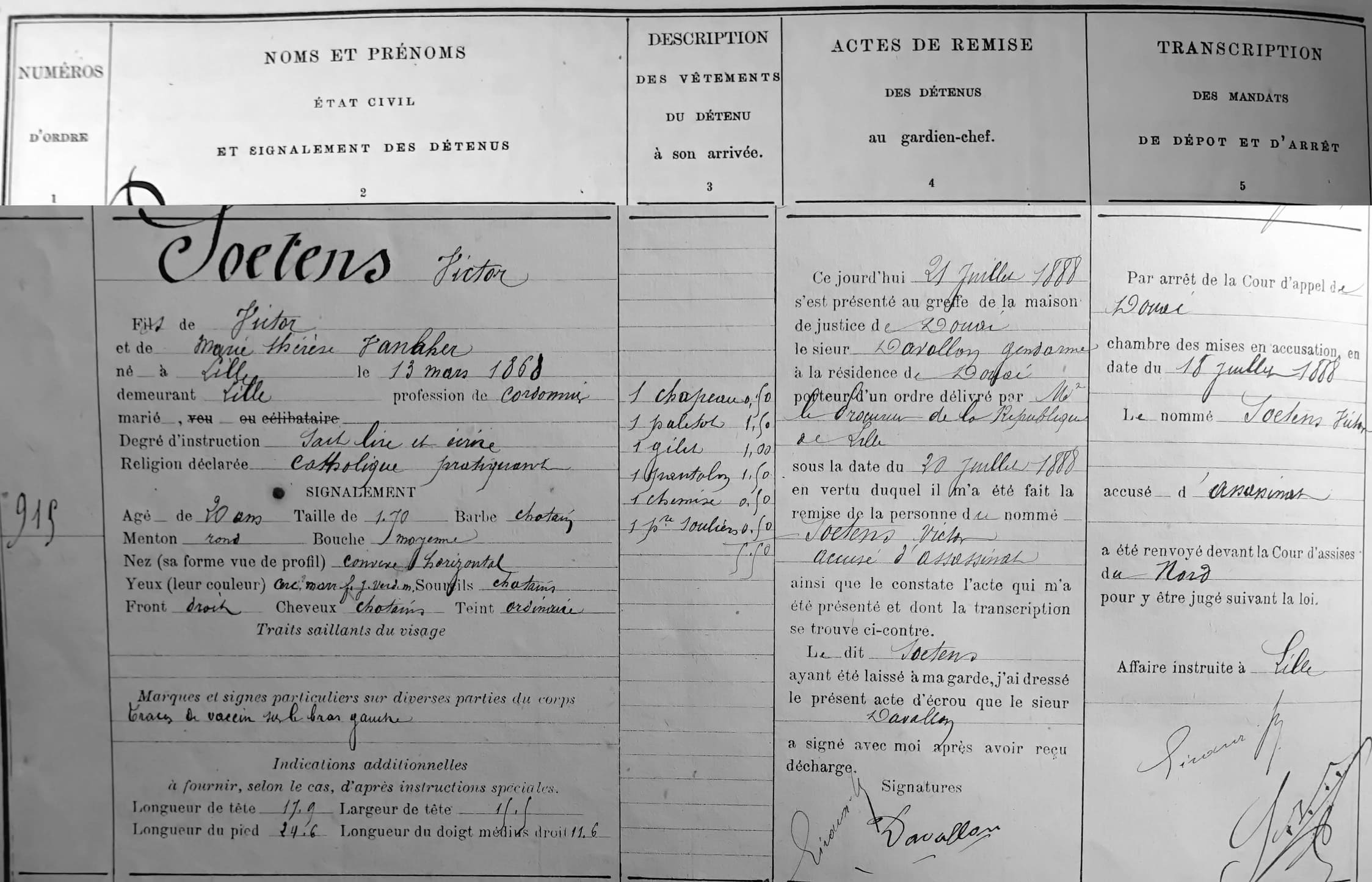 Soetens Victor, âgé de 20 ans, né à Lille, le 13 mars 1868, ouvrier cordonnier, demeurant au dit Lille
