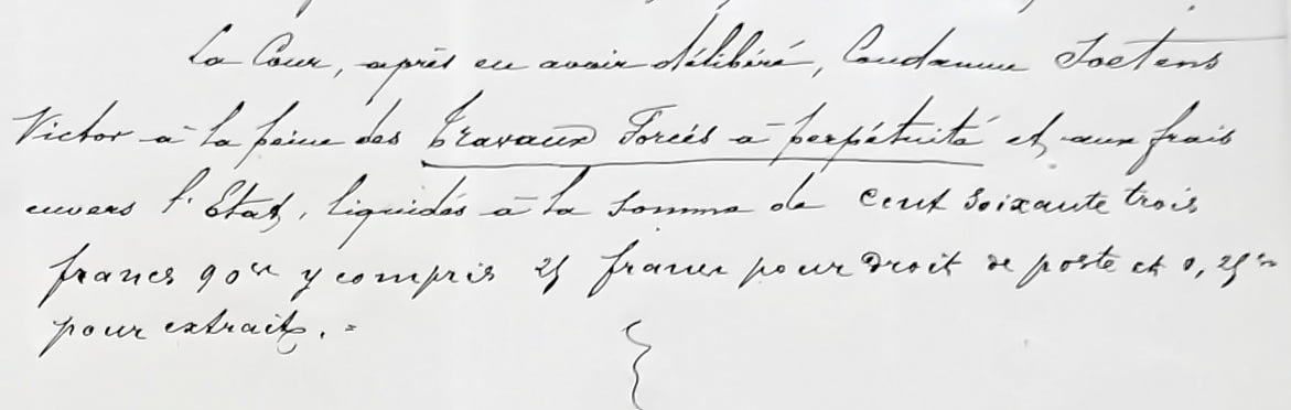 M. le Président a lu le texte de la loi et prononce l’arrêt qui condamne Victor Soetens à la peine des travaux forcés à perpétuité et au frais du procès envers l’Etat.