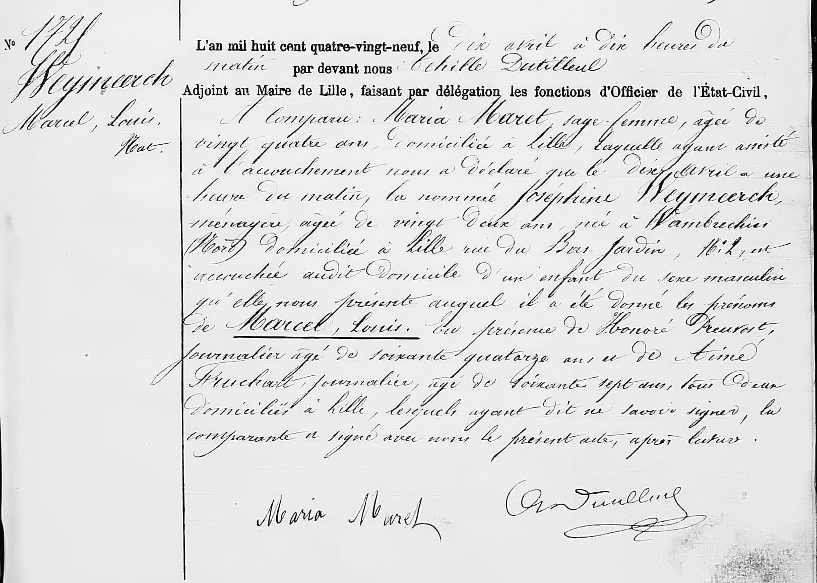 Le mercredi 10 avril 1889 à une heure du matin, Joséphine Weymeerch accoucha chez elle, aidée d’une sage-femme, d’un petit garçon, Marcel Louis.