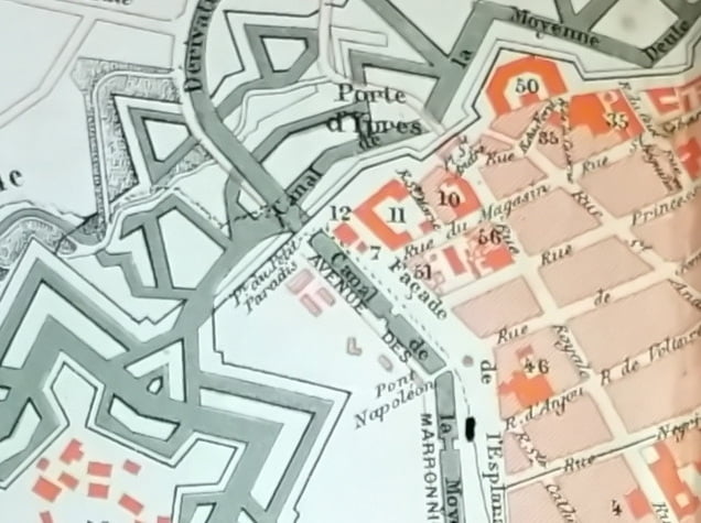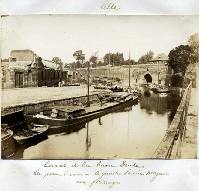 Il nous a alors conduit sur l’invitation que nous lui en avons faite, de nous faire suivre le même itinéraire que celui suivi par lui le jour du crime, il nous a conduit disons nous, jusque au pont du « Petit Paradis » situé à l’extrémité de cette promenade. Il nous a fait traverser ce pont, puis tourner à gauche par un petit sentier sur le glacis des fortifications, en face le « grand carré » et en nous faisant constamment suivre sur les glacis ce sentier toujours sur la gauche, nous sommes ainsi arrivés à une voûte ou sorte de pont livrant passage à une rigole de desséchement qui vient se décharger dans la Deûle près du pont du Petit Paradis ; cet endroit est situé à … mètres de distance du Petit Paradis. Là Soetens nous a déclaré qu’il s’est assis sur le talus à quinze mètres environ en avant du pont, il a attendu une heure et demie, nous dit-il, tenant son enfant dans ses bras, puis il a descendu le talus jusqu’au pont où il a précipité à l’eau son enfant qu’il venait d’étrangler. Le corps a été entrainé par le courant, sur une longueur de six mètres environ ; Soetens dit ensuite l’avoir retiré de l’eau et replacé sur le bord, puis quand il s’est aperçu que l’enfant ne donnait plus signe de vie, il l’a rejeté à l’eau et suivant encore le bord de la rigole, presque jusqu’au pied du rempart, il l’a rattrapé dans l’angle que forment le bastion avec le talus. Il allait l’emporter avec lui, lorsque croyant apercevoir un garde, il a pris peur dit-il et il a rejeté l’enfant derrière lui sans savoir comment le petit corps serait retombé à l’eau.