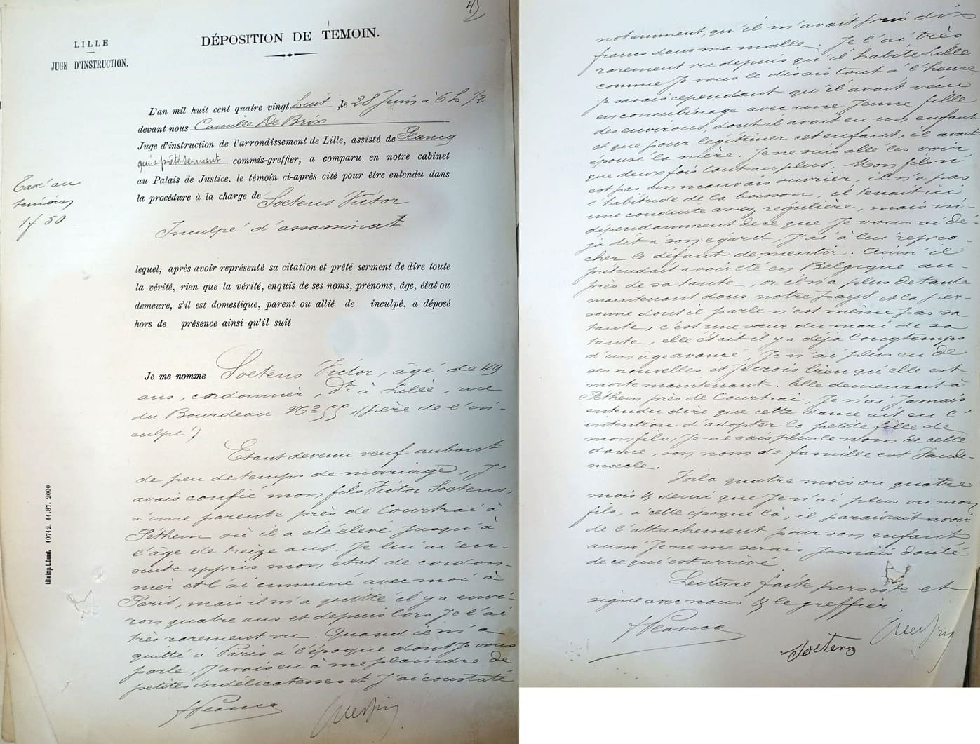 Etant devenu veuf au bout de peu de temps de mariage, j’avais confié mon fils Victor Soetens, à une parente près de Courtrai à Pittem où il a été élevé jusqu’à l’âge de treize ans. Je lui ai ensuite appris mon état de cordonnier et l’ai emmené avec moi à Paris, mais il m’a quitté il y a environ quatre ans et depuis lors je l’ai très rarement vu. Quand il m’a quitté à Paris à l’époque dont je vous parle, j’avais eu à me plaindre de petites indélicatesses et j’avais constaté notamment qu’il m’avait pris dix francs dans ma malle. Je l’ai très rarement vu depuis qu’il habite Lille comme je vous le disais tout à l’heure. Je savais cependant qu’il avait vécu en concubinage avec une jeune fille des environs, dont il avait eu un enfant et que pour légitimer cet enfant, il avait épousé la mère. Je ne suis allé les voir que deux fois tout au plus. Mon fils n’est pas un mauvais ouvrier, il n’a pas l’habitude de la boisson, il tenait ici une conduite assez régulière, mais indépendamment de ce que je vous ai déjà dit, j’ai à lui reprocher le défaut de mentir. Ainsi il prétendait avoir été en Belgique auprès de sa tante, or il n’a plus de tante maintenant dans notre pays et la personne dont il parle n’est même pas sa tante, c’est une sœur du mari de sa tante, elle était il y a déjà longtemps d’un âge avancé. Je n’ai plus eu de ses nouvelles et je crois bien qu’elle est morte maintenant. Elle demeurait à Pittem près de Courtrai. Je n’ai jamais entendu dire que cette dame ait eu l’intention d’adopter la petite fille de mon fils. Je ne sais plus le nom de cette dame, son nom de famille est Vandemoecle.