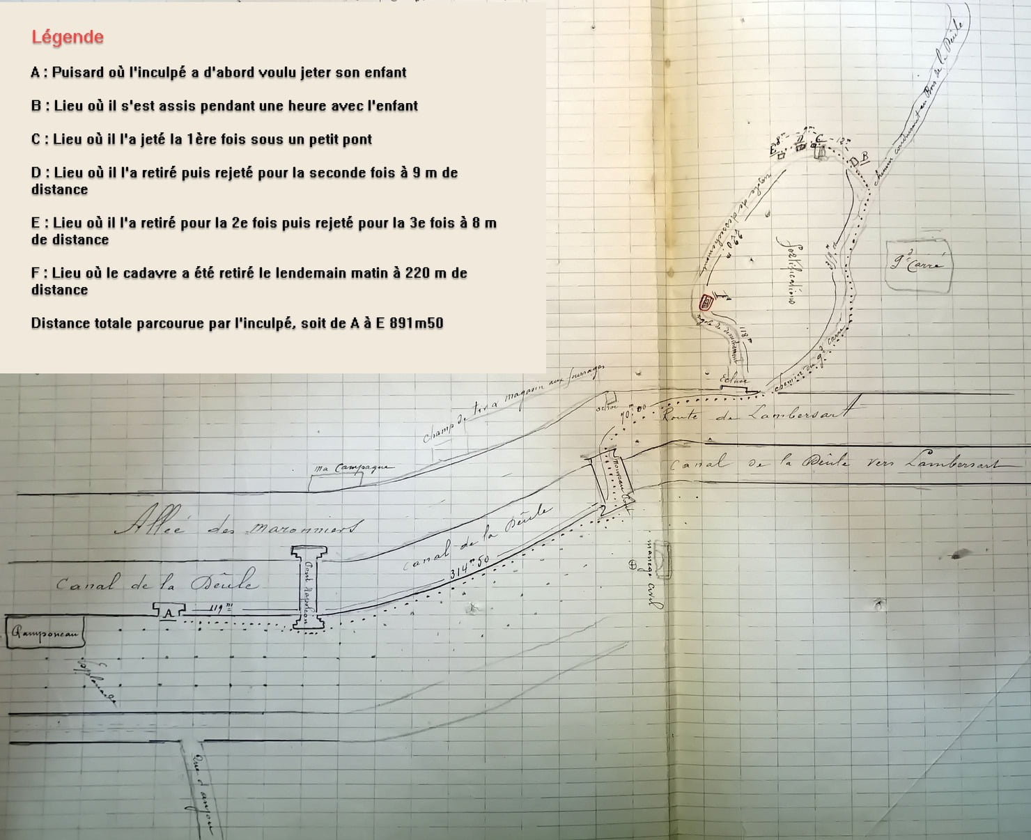 Il nous a alors conduit sur l’invitation que nous lui en avons faite, de nous faire suivre le même itinéraire que celui suivi par lui le jour du crime, il nous a conduit disons nous, jusque au pont du « Petit Paradis » situé à l’extrémité de cette promenade. Il nous a fait traverser ce pont, puis tourner à gauche par un petit sentier sur le glacis des fortifications, en face le « grand carré » et en nous faisant constamment suivre sur les glacis ce sentier toujours sur la gauche, nous sommes ainsi arrivés à une voûte ou sorte de pont livrant passage à une rigole de desséchement qui vient se décharger dans la Deûle près du pont du Petit Paradis ; cet endroit est situé à … mètres de distance du Petit Paradis. Là Soetens nous a déclaré qu’il s’est assis sur le talus à quinze mètres environ en avant du pont, il a attendu une heure et demie, nous dit-il, tenant son enfant dans ses bras, puis il a descendu le talus jusqu’au pont où il a précipité à l’eau son enfant qu’il venait d’étrangler. Le corps a été entrainé par le courant, sur une longueur de six mètres environ ; Soetens dit ensuite l’avoir retiré de l’eau et replacé sur le bord, puis quand il s’est aperçu que l’enfant ne donnait plus signe de vie, il l’a rejeté à l’eau et suivant encore le bord de la rigole, presque jusqu’au pied du rempart, il l’a rattrapé dans l’angle que forment le bastion avec le talus. Il allait l’emporter avec lui, lorsque croyant apercevoir un garde, il a pris peur dit-il et il a rejeté l’enfant derrière lui sans savoir comment le petit corps serait retombé à l’eau.