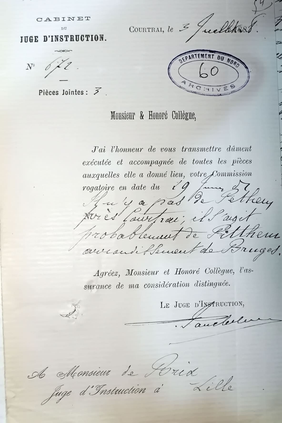 De tout ce qui précède nous avons dressé le présent procès verbal pour être adressé à Monsieur le Juge d’Instruction Jonckheere à Courtrai et copie en être transmise hiérarchiquement à notre Capitaine.