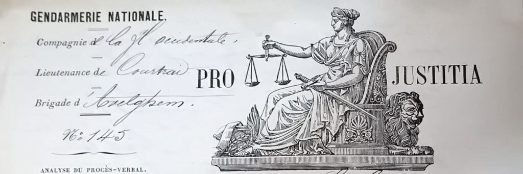 L’an 1800 quatre-vingt-huit le deux juillet, nous soussignés Vanderhallen Pierre Toussaint brigadier et Yde Victor, gendarme, tous deux en résidence à Avelghem, revêtus de notre uniforme, certifions avoir pris les renseignements ci-après conformément à l’apostille du 30 juin dernier N°653 de Monsieur le Juge d’Instruction Jonckheere de Courtrai :