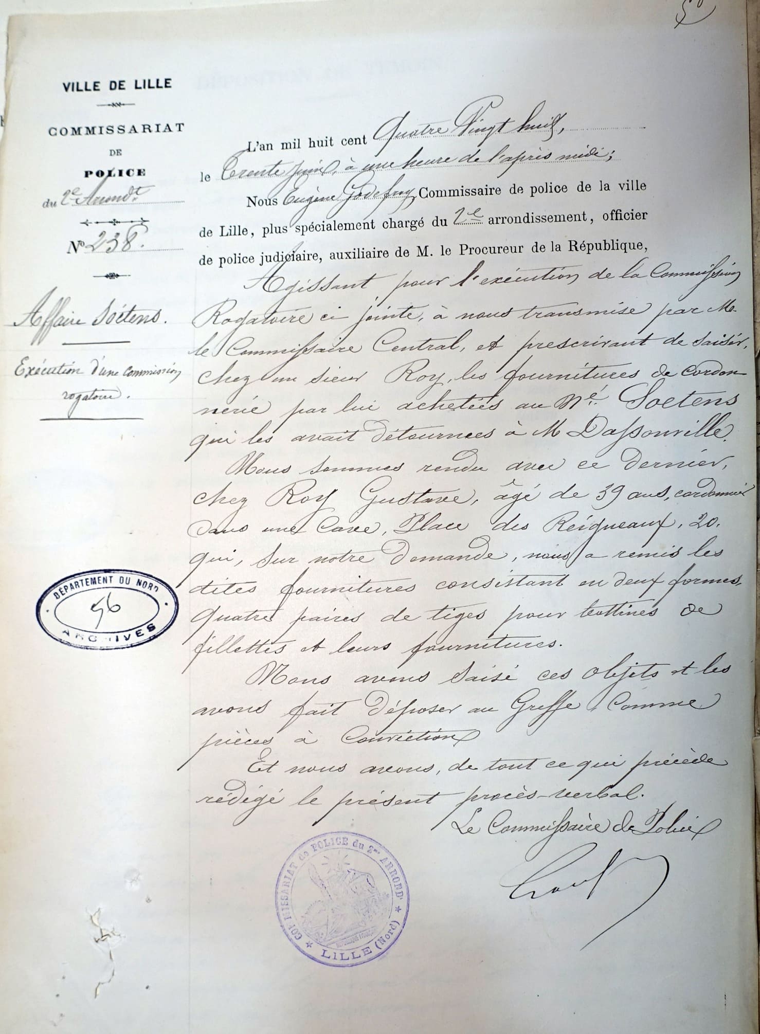 Ainsi que je vous ai fait connaître, le dimanche 24 juin courant, vers huit heures et demie, neuf heures du matin, je suis parti pour Courtrai par le chemin de fer avec les cinq francs que j’avais obtenus en engageant les fournitures de cordonnerie de mon patron, le sieur Dassonville, chez le cordonnier Roy, sur la place des Reignaux.