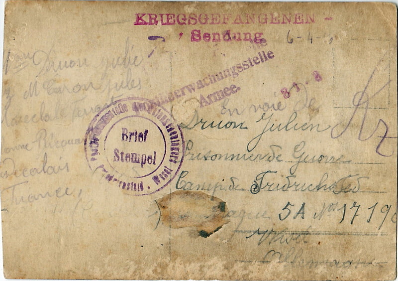 Il s’agit d’une carte postale du 6 avril 1916 envoyée à un certain Julien Druon, prisonnier de guerre au camp de Friedrichsfeld en Allemagne.