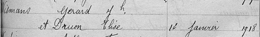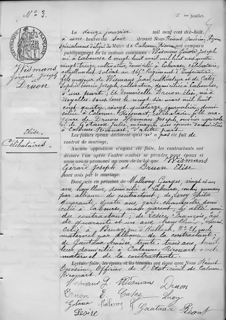 Le douze janvier mil neuf cent dix-huit, à une heure du soir devant Nous Réant Onésime, Adjoint spécialement délégué du maire de Calonne-Ricouart, ont comparu publiquement en la maison commune : Wismans Gérard Joseph né à Labourse le vingt-huit avril mil huit-cent-quatre-vingt-treize, cultivateur, domicilié à Labourse, célibataire, actuellement soldat au 165e Régiment d’Infanterie, fils majeur de Wismans Jean cultivateur et de Catez Sophie Léonie Joseph, cultivatrice, domiciliés à Labourse, d’une part ; et demoiselle Druon Elise, née à Noyelles-sous-Lens le vingt-six mars mil huit-cent-quatre-vingt-quatorze, journalière, domiciliée à Calonne-Ricouart, célibataire, fille majeure de Druon Herman Joseph, ouvrier agricole et de Gotaux Julie, ménagère son épouse domiciliés à Calonne-Ricouart, d’autre part