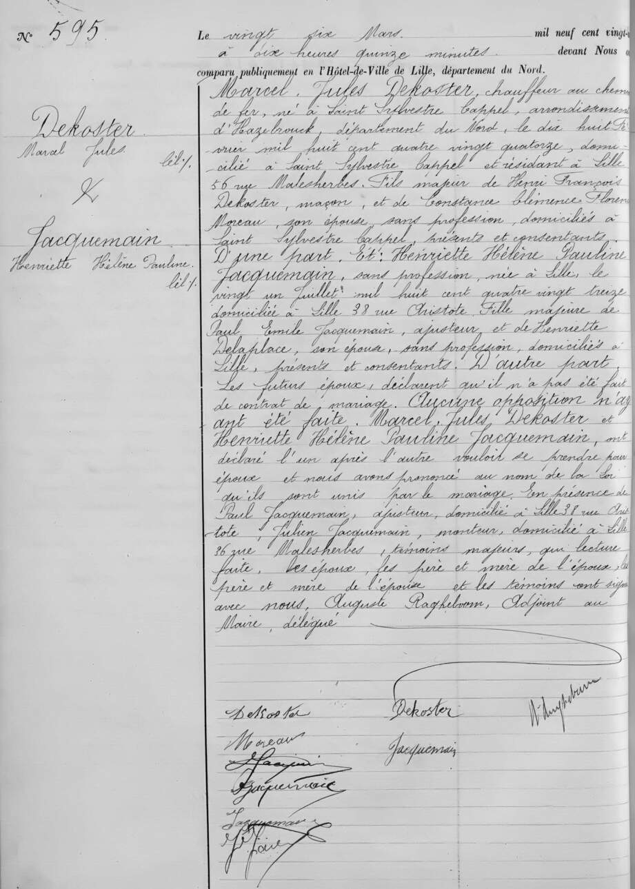 A son retour il épousa Henriette JACQUEMAIN le samedi 26 mars 1921 à Lille.