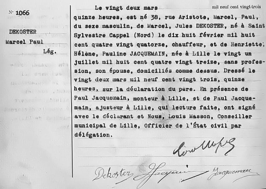 Marcel déclare la naissance de son fils l’après-midi même, accompagné du père et du frère de son épouse.