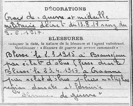 Il fut par deux fois grièvement blessé par des éclats d’obus et décoré de la Croix de Guerre.